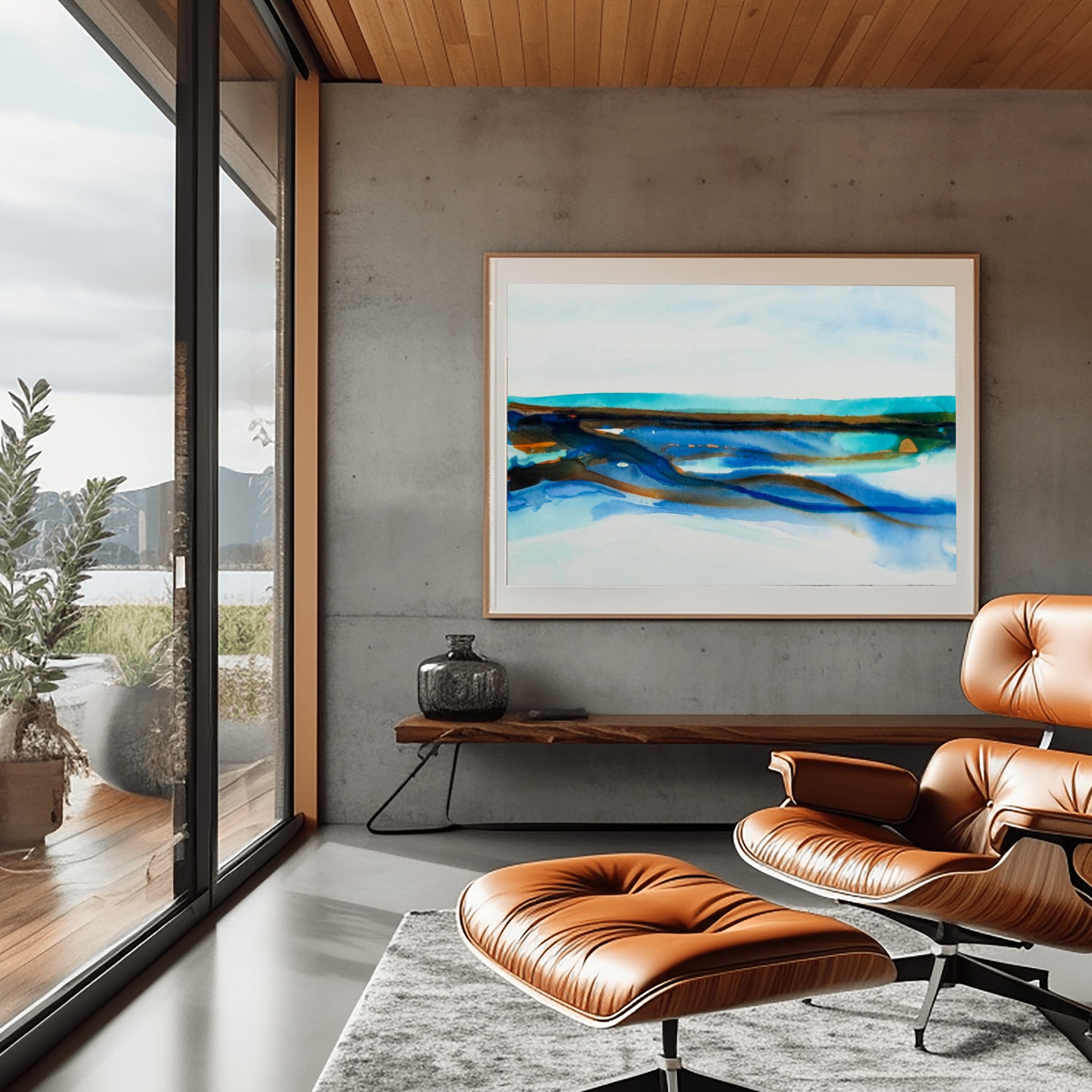 'Shallow Waters VI' channels the ebb and flow of tide pools, combining bold marine blues with warm undertones and translucent veils of ink. This piece blends coastal energy with refined abstraction, ideal for modern coastal interiors