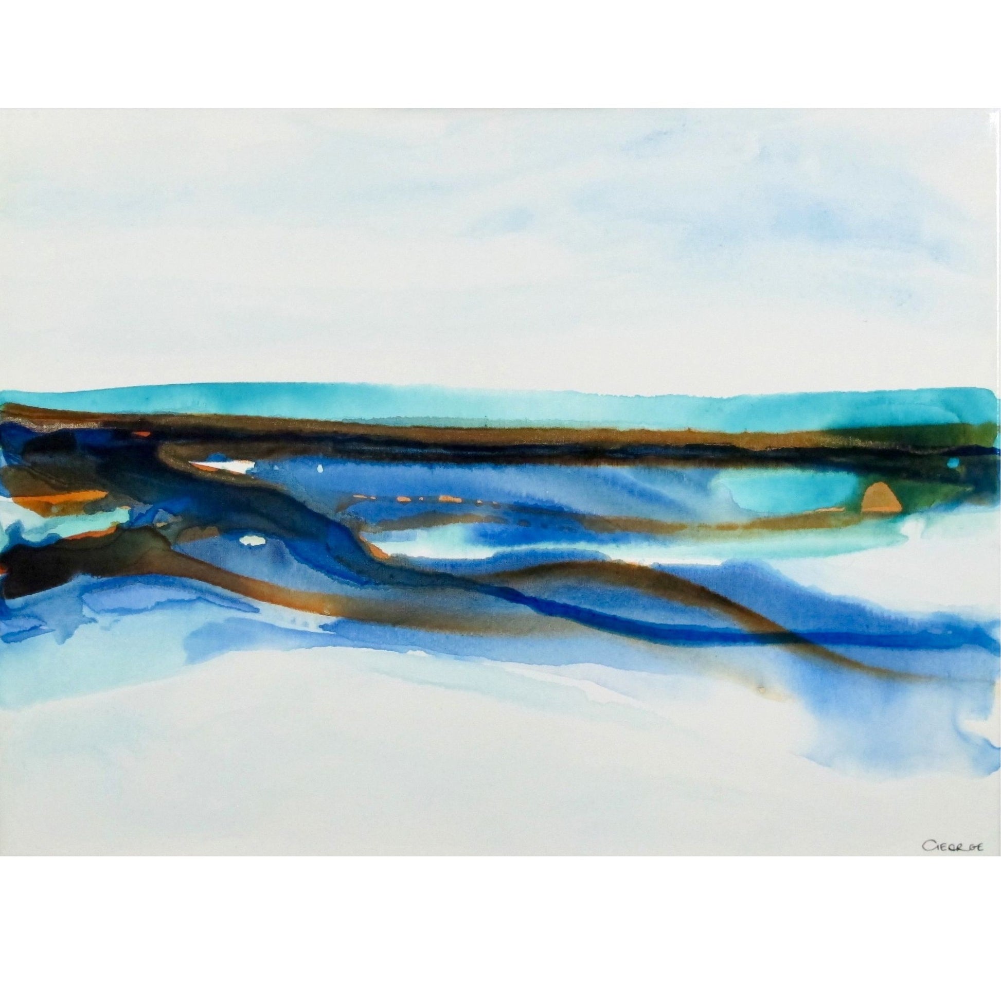 'Shallow Waters VI' channels the ebb and flow of tide pools, combining bold marine blues with warm undertones and translucent veils of ink. This piece blends coastal energy with refined abstraction, ideal for modern coastal interiors